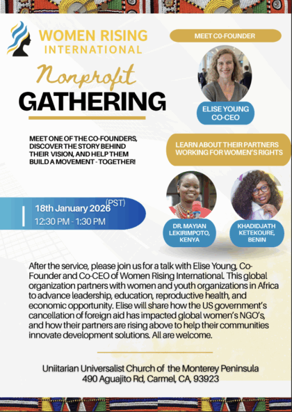 After the service next Sunday, Jan 18, at 12:30, please join us for a talk with Elise Young, Co-Founder and Co-CEO of Women Rising International, our shared offering recipient for this month. This global organization based in Washington, DC partners with women and youth organizations in Africa to advance leadership, education, reproductive health, and economic opportunity. Elise will share how the US government’s cancellation of foreign aid has impacted global women’s NGO’s, and how their partners are rising above to help their communities innovate development solutions. All are welcome.