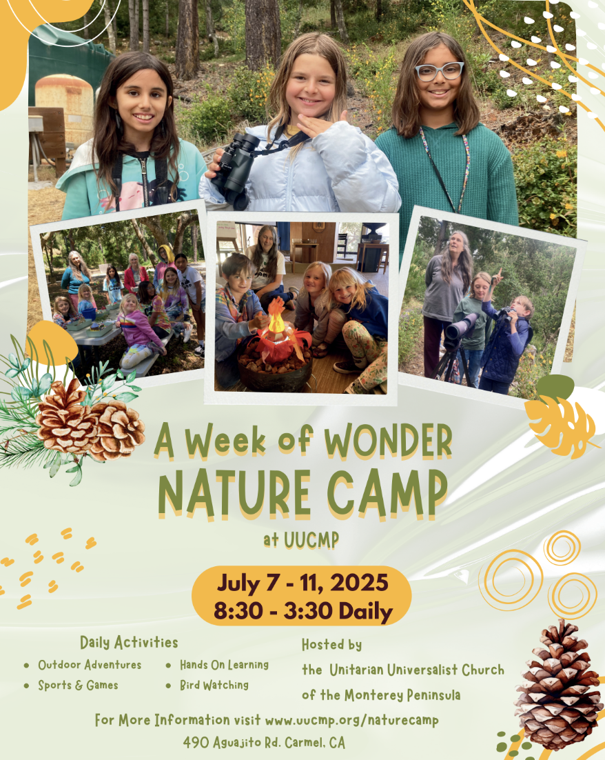 At the UUCMP Nature Camp, campers ages 6-12 will learn about how various species interact with each other and with humans, and are adapted to life in California’s diverse ecosystems. We’ll explore the natural world through walks on our lovely campus, engage in hands-on learning activities to understand the plants, animals, and fungi around us, make crafts, sing songs, and play games.